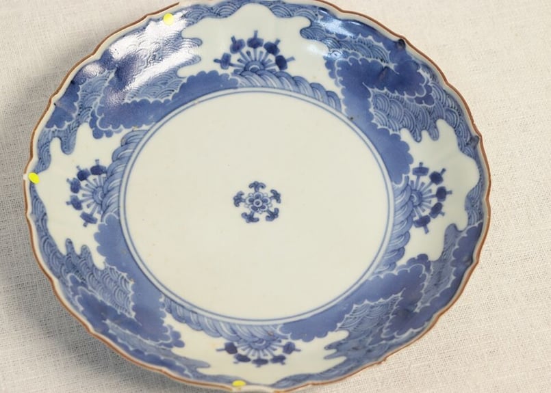 - 美術品・アンティーク・コレクション > 工芸品 > 江戸中期 藍柿右衛門 六角 向付5客 トカチ 本さ5-0514⭐︎ 江戸中期染付藍柿右衛門四方波と水車図6.5寸皿 小ホツ,色薄め