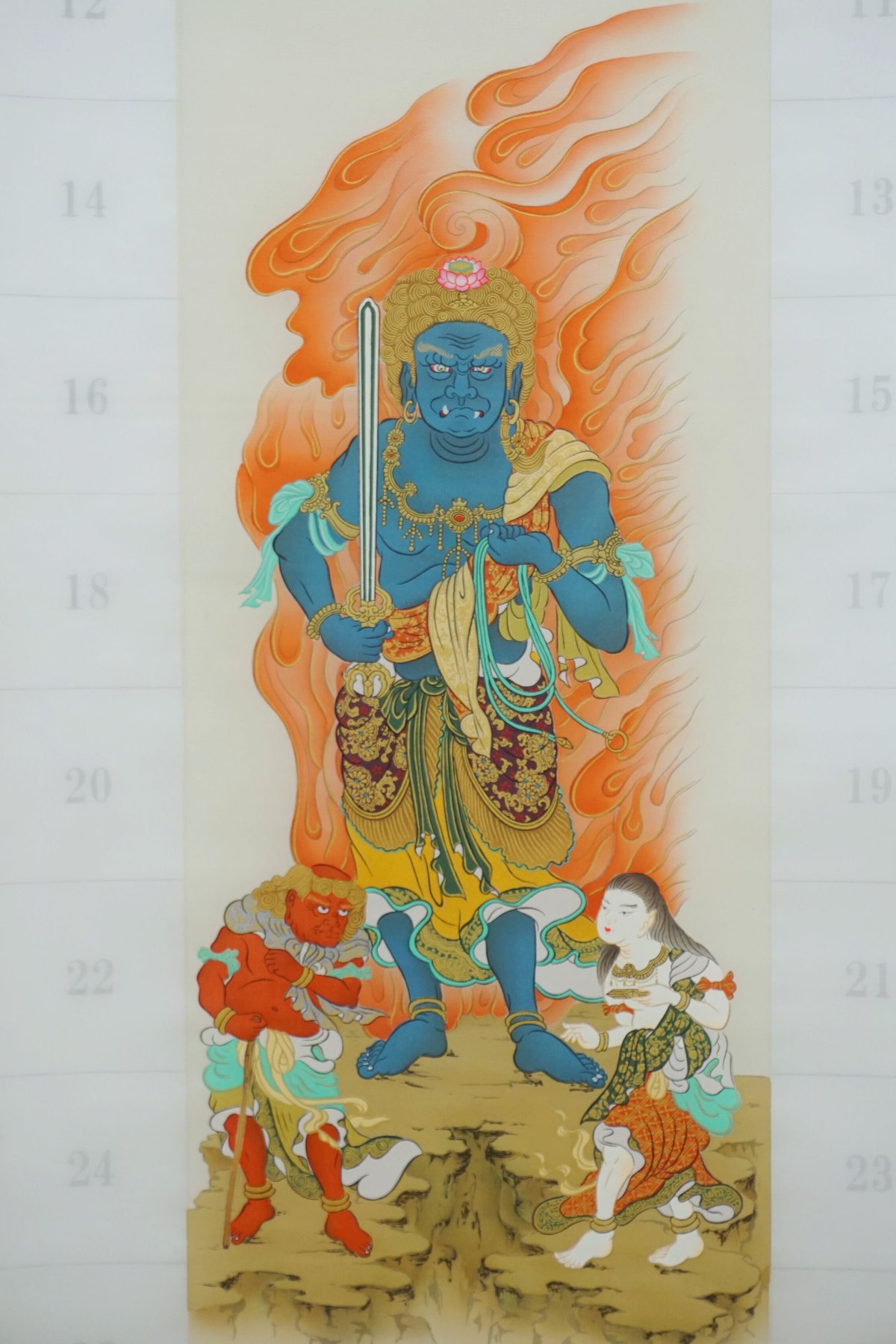 | 商品の特徴 | 不動明王】三十六不動尊霊場 | 松月堂 online store。三十六不動尊納経軸 不動三尊図 | 通販 通信販売 | 札所0番。美品 掛け軸 近畿三十六不動尊霊場御集印 不動明王 仏画 年中。ご覧いただきありがとうございます。西国三十六ケ所不動明王霊場の朱印軸です。不動明王尊の憤怒のお顔、お姿が大変力強く迫力があります。今にも軸から出てこられる勢いの仏画です。不動明王の脇侍(わきじ)である矜羯羅童子(こんがらどうじ)と制多迦童子(せいたかどうじ)はいらっしゃいませんが二童子が描かれていない事で、更に不動明王自体に迫力を感じます。表装も最高のものを使用しており、上部の紐から下部の軸棒まで何の汚れもなくシミ、汚れ、ヤケなどもなく綺麗な状態です。我が家に同じ不動明王朱印軸が二幅ありますので一幅をお譲りします。#西国不動霊場 朱印軸。三十六不動尊納経軸 不動三尊図 | 通販 通信販売 | 札所0番。。天保五年辨算筆普賢地蔵菩薩額。【かみあつ様用】狩野尚信「唐子」掛軸 絹本 識箱。書道具 中国古墨 上海墨廠精製 月落烏啼 油煙一〇一 135g未使用。軸 商売繁盛 お守り 絵 白狐 稲荷 神 御神符 日本 美術 骨董 インテリア。拓本 屈原画像 費新我左筆 暁飛画 中国戦国時代 政治家 詩人 書家 掛け軸 | ||